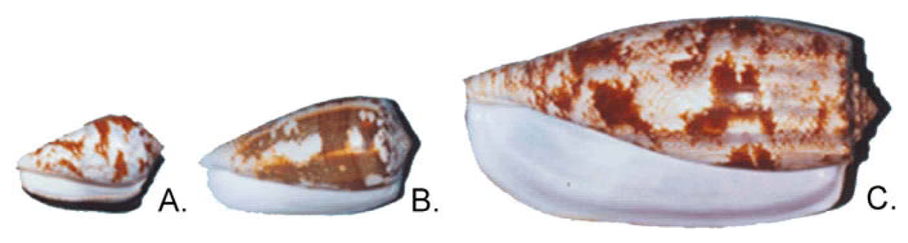 The shells of three piscivorous cone snails. A, Conus catus (2–3 cm); B, C. magus (3–4 cm); and C, C. geographus (~6 cm).