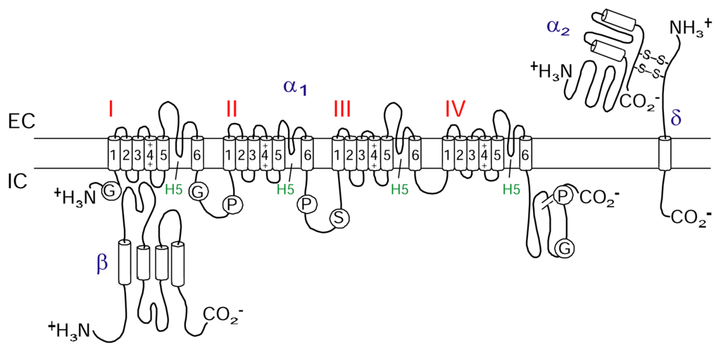 Schematic figure of a neuronal calcium channel. The cartoon shows four domains with six transmembrane helices in each making up the pore-forming α-subunit. Also shown are the intracellular auxiliary β-subunit and the transmembrane δ-subunit disulfide bonded with the extracellular auxiliary α2-subunit forming the α2/δ-subunit.