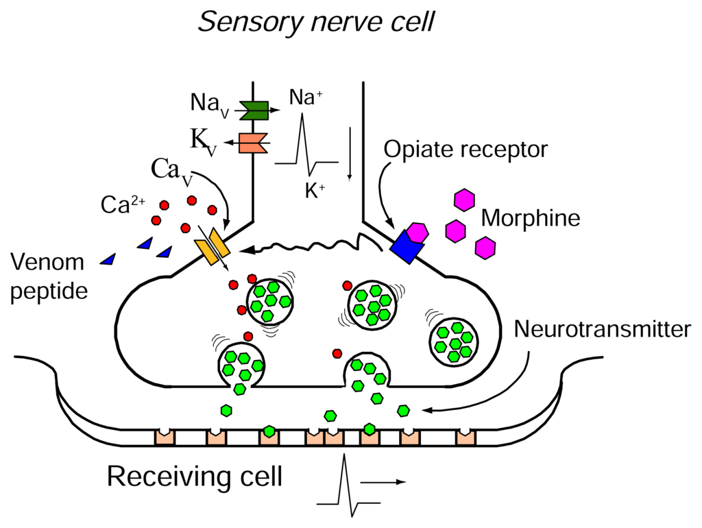 Schematic figure of the presynaptic nerve terminal. Calcium influx through a N-type CaV channel causes neurotransmitter release and propagation of the pain message. The propagation of the action potential and thereby the influx of calcium can be blocked by venom (e.g., Ziconotide or AM336). Activation of the opioid receptor leads to inhibition of the N-type CaV channel via G-protein coupled receptor by changing channel gating and by altering ion permeation.