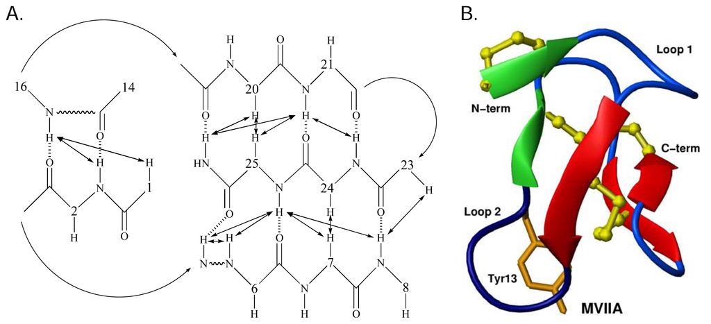 A. The β-sheet network of MVIIA. Double-headed arrows indicate observed NOEs and dashed lines represent putative H-bonds. B. Three dimensional solution structure of MVIIA. The three disulfide bridges (yellow ball and stick), the β-bridge region (green arrows), β-sheet region (red arrows) and the orientation of Tyr13 (orange) can be seen. Adapted from Nielsen et al. [126].