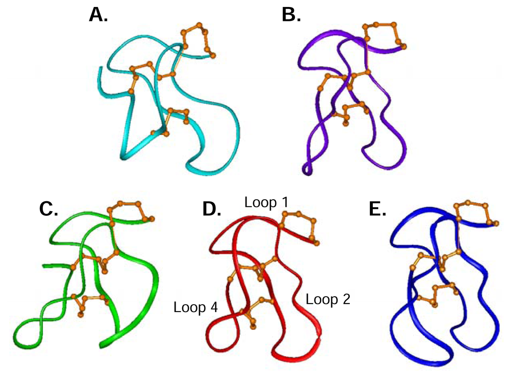 Representative ribbon structures of five ω-conotoxins. (A) L-type CaV channel blocker TxVII [127]. (B) P/Q-type CaV channel blocker MVIIC [122]. N-type CaV channel blockers GVIA (C)[116], MVIIA (D) (Schroeder et al. unpublished results), and CVID (E)[10]. Disulfide connectivity (orange) and Loop 1, Loop 2 and Loop 4 are indicated. Peptides were superimposed across the backbone atoms C, Cα, and N for residue 1–14.