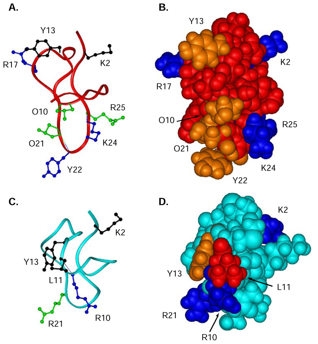 Ribbon (A, C) and CPK (B, D) representation of 3D solution structures of GVIA (red) [116], and MVIIA (cyan) (Schroeder et al. unpublished results). (A, C) Ribbon of GVIA and MVIIA, respectively, showing residues important for binding in ball and stick. The most important residues are shown in black, secondary important residues are indicated in blue and residues contributing slightly shown in green. (B, D) CPK representation of GVIA and MVIIA, respectively are shown. Charged residues are coloured in dark blue, hydrophobic residues in red and hydroxyl-containing residues are coloured orange.
