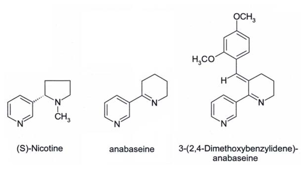 Structure of (S)-nicotine, anabaseine and its 2,4-dimethoxybenzylidene derivative, DMXBA. While nicotine and anabaseine stimulate a wide variety of vertebrate AChRs, DMXBA selectively stimulates α7-type AChRs.