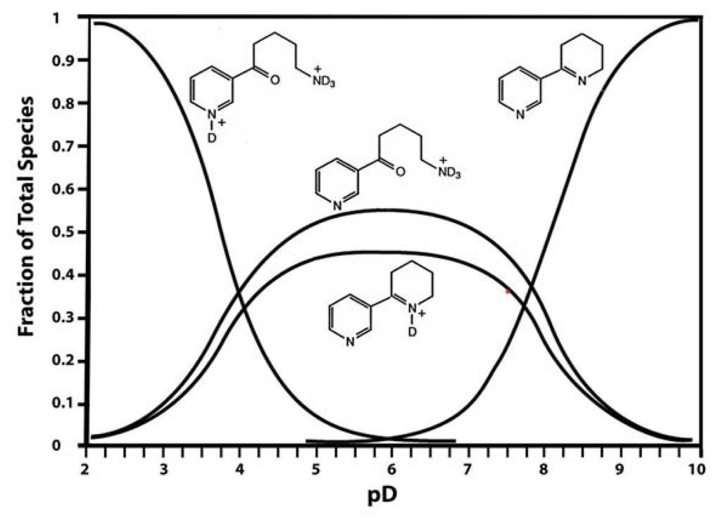 Equilibrium between the four major forms of anabaseine in aqueous solution as a function of pD [95]. Note that pD = pH + 0.4.