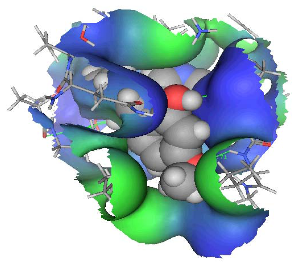 Close view of the α7 AChR binding pocket for 2OH-MBA (modified from [90]). The molecule is in the protonated form. Green and blue areas represent the hydrophobic and the hydrophilic surfaces, respectively, found in the binding pocket. The ligand is colored according to the atomic types: red (oxygen), gray (carbon), blue (nitrogen), and light-grey (hydrogen).
