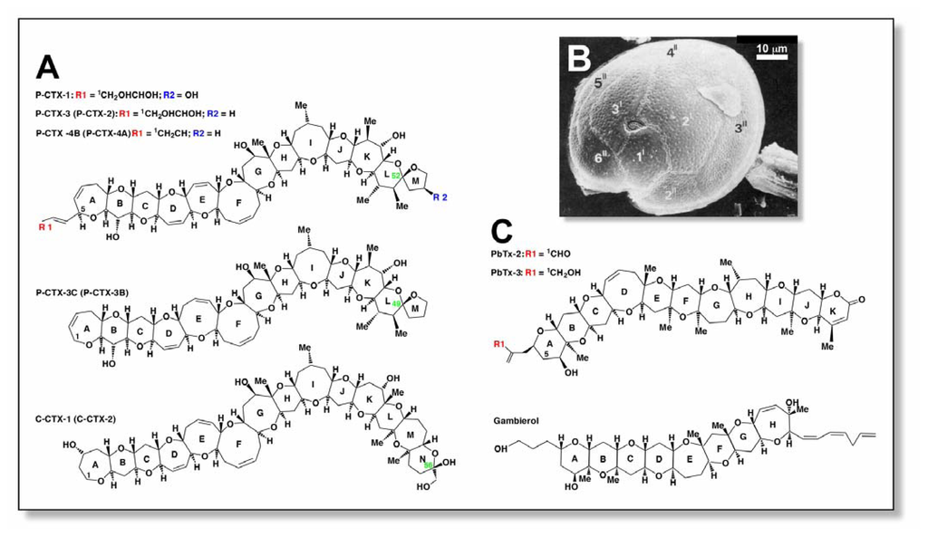 The increased harvesting of marine resources and the advancement of rapid cold transport and shipping technologies has resulted in an increasing incidence of human intoxication associated with fish consumption. In terms of the number and severity of poisoning events, ciguatera is arguably the most significant form of these fish toxicoses. Ciguatera poisoning is a type of ichthyosarcotoxism that occurs as a consequence of eating certain tropical and sub-tropical reef fish species from the Indo-Pacific Oceans and Caribbean Sea that have bioaccumulated the marine neurotoxin, ciguatoxin (CTX). The ciguatoxins are derived from blooms of certain strains of epiphytic benthic marine dinoflagellates. This link was not established until 1977, when a Japanese/French team led by Takeshi Yasumoto and Raymond Bagnis found large numbers of a species of dinoflagellate in a toxic sample of detritus collected in the Gambier Islands in French Polynesia during a large ciguatera outbreak [1]. This organism was linked to the production of ciguatera toxins in the Pacific and was subsequently named Gambierdiscus toxicus (Dinophyceae) [2] (Fig. 1B).