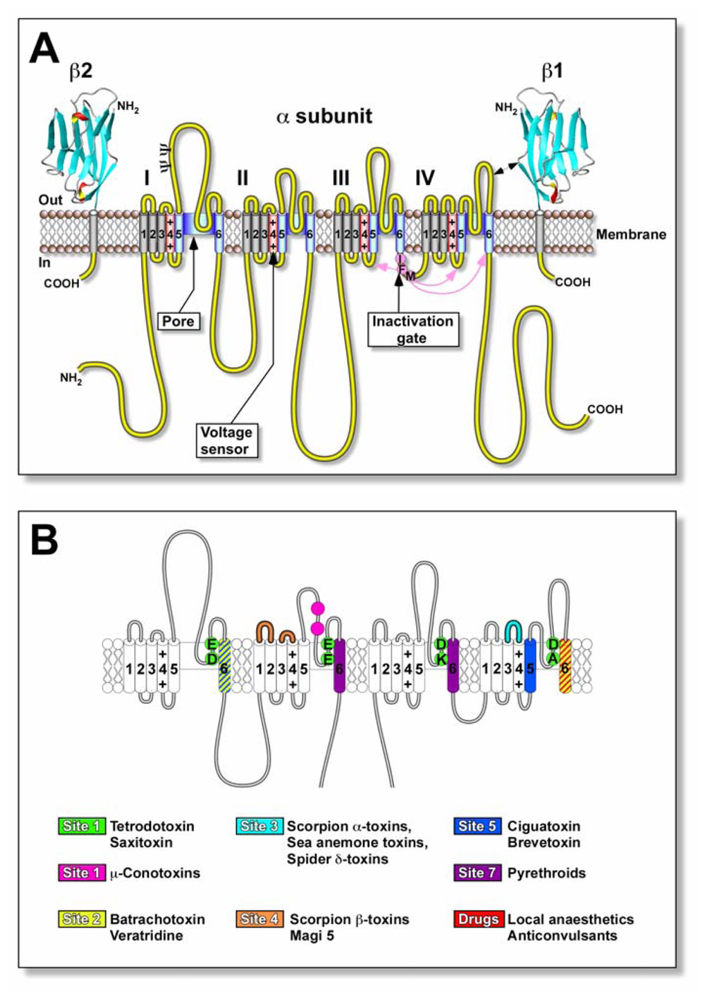 Molecular structure and neurotoxin receptor sites of the Nav channel. (A) Schematic representation of the subunit structure of the Nav channel showing the functional α-subunit and ancillary β-subunits. Cylinders represent the α-helical segments where the charged S4 segments (red) represent the voltage sensors. The inactivation gate (magenta) is represented by the inactivation particle (residues IFM). The walls of the ion-conducting pathway are shown in blue. The β1 and β2 subunits are represented as immunoglobulin-like folds similar to myelin protein P0[111]. Ψ, sites of probable N-linked glycosylation. (B) Location of known neurotoxin receptor sites on Nav channels. Green circles represent the outer (EEDD) and inner (DEKA) rings of amino acid residues that form the ion selectivity filter and the proposed neurotoxin receptor site 1 for the water-soluble guanidinium.