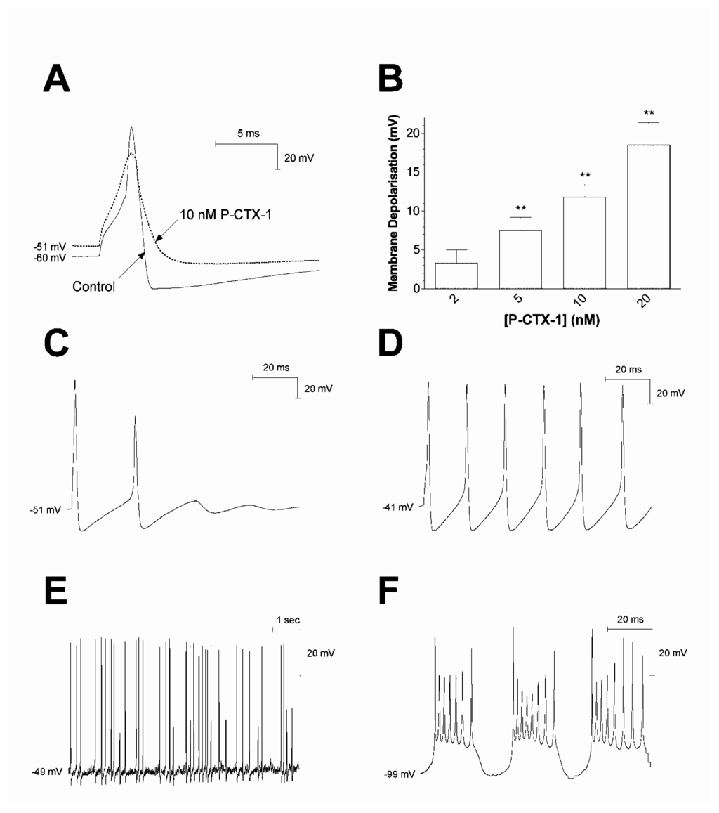 Effect of P-CTX-1 on action and resting potentials in DRG neurons expressing TTX-sensitive Nav channels. (A) Superimposed typical action potentials generated, before and following a 10-min perfusion with 10 nM P-CTX-1 showing reduced spike and afterhyperpolarisation amplitude, prolongation of action potential and afterhyperpolarisation duration, and membrane depolarisation. The dotted line in represents the control resting membrane potential. (B) Concentration-dependent membrane depolarisation occurred in response to a 5–10 min perfusion with P-CTX-1 (n ≥ 5). Statistical significance indicated at the ** P <0.01 level. (C-D) Typical progression of stimulus-locked repetitive action potential firing from limited repetitive firing (C), to trains of action potentials (D), in the presence of 10 nM P-CTX-1. (E) Typical tonic action potential firing in the presence of 10 nM P-CTX-1, where spontaneous firing was not locked to a depolarising stimulus. (F) Return of repetitive firing following manual hyperpolarisation of the resting membrane potential. Modified from Birinyi-Strachan et al. [109].