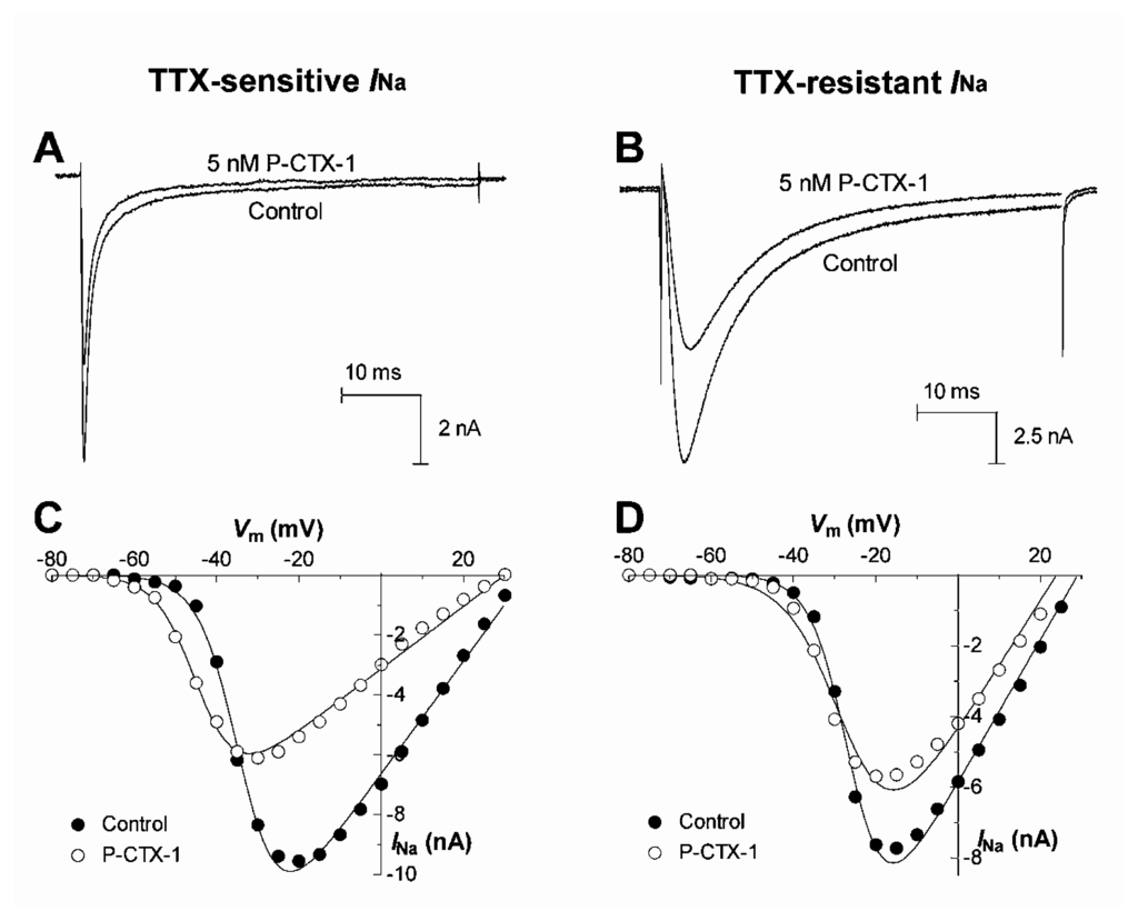 Upper panels show typical effects of 5 nM P-CTX-1 on TTX-sensitive (A) and TTX-resistant (B)INa in DRG neurons. Currents were elicited using 50 ms depolarizing test pulses to −10 mV from a holding potential of −80 mV every 10 s. Lower panels show typical effects of P-CTX-1 on the voltage-dependence of activation of TTX-sensitive (C) and TTX-resistant (D)INa. Test pulse protocols consisted of 50-ms depolarising test pulses from a holding potential of −80 mV to +70 mV in 5-mV increments before, and 10 min after perfusion with 5 nM P-CTX-1. The peak INa at each voltage step was measured and plotted as a function of membrane potential in the absence (○) and presence of 5 nM P-CTX-1 (●). Modified from Strachan et al. [114].