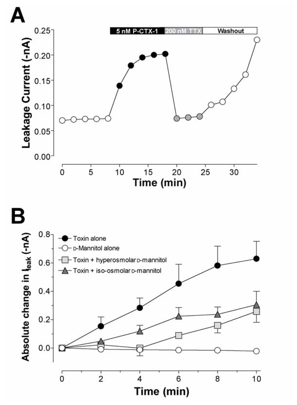 Timecourse of leakage current (Ileak) produced by P-CTX-1 in DRG neurones. (A) Timecourse of changes in Ileak induced by 5 nM P-CTX-1 in a cell expressing TTX-sensitive INa currents and reversal by TTX (200 nM). The effects of TTX, but not those of P-CTX-1, were reversed upon washing with toxin-free solution. (B) Action of d-mannitol on the P-CTX-1-induced rise in Ileak through TTX-sensitive Nav channels. Absolute changes in Ileak (–nA) were recorded in either (squares) hyperosmolar (n = 13) or (triangles) iso-osmolar (n = 9) 50 mM d-mannitol solutions. Data were recorded during a 10 min perfusion in d-mannitol alone (open circles). Cells were then perfused with 5 nM P-CTX-1 in the presence of either hyper- or iso-osmolar 50 mM d-mannitol. The mean rise in Ileak after perfusion with 5 nM P-CTX-1 alone (closed circles) is shown for comparison. Significant Ileak was not associated with the CTX-modified TTX-resistant Nav channels. Modified from Birinyi-Strachan et al. [126] and Strachan et al. [114].