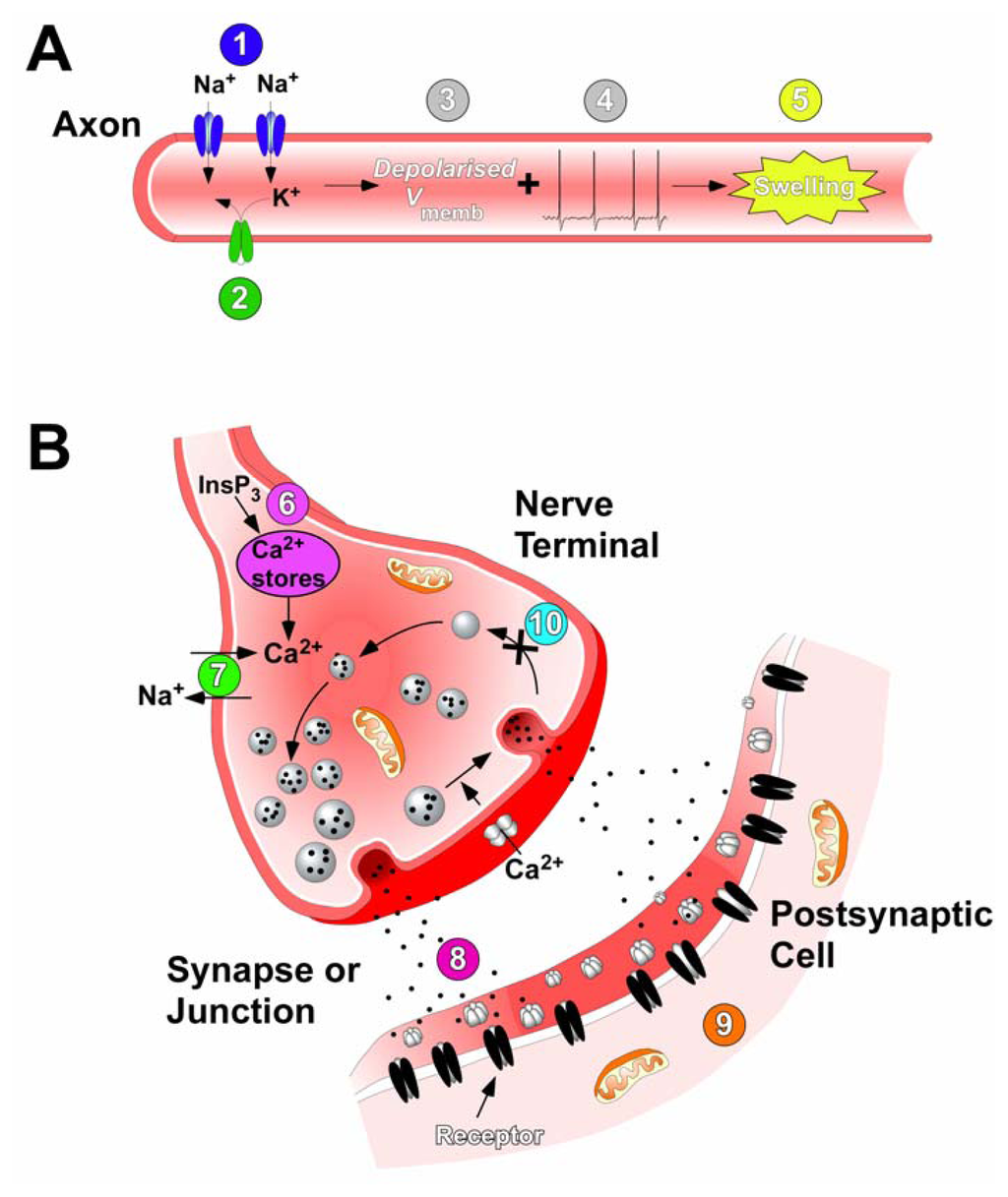 Sites and modes of action of ciguatoxins. (A) In motor and sensory neurons ciguatoxins cause persistent activation of Nav channels (1) and block Kv channels (2). This causes both membrane depolarisation (3) and leads to spontaneous and repetitive action potential firing (4). The resultant Na+ loading causes swelling of axons, nerve terminals and perisynaptic Schwann cells (5). (B) At synapses, ciguatoxins elevate the intracellular Ca2+ concentration via InsP3-mediated Ca2+ release from internal stores (6) or via activation of Cav channels due to terminal depolarisation (8). Also intracellular concentrations of Ca2+ increase due to an alteration in the Na+ gradient driving the Na+-Ca2+ exchanger (7), an effect that also occurs in cardiac myocytes. The tonic action potential firing initiated in axons induces repetitive, synchronous and asynchronous neurotransmitter release at synapses and the neuromuscular junction (9), to produce transient increases and decreases in the quantal content of synaptic responses. This results in spontaneous and tetanic muscle contractions (10). In addition, ciguatoxins also impair synaptic vesicle recycling that exhausts the pool of neurotransmitter vesicle available for release (11).