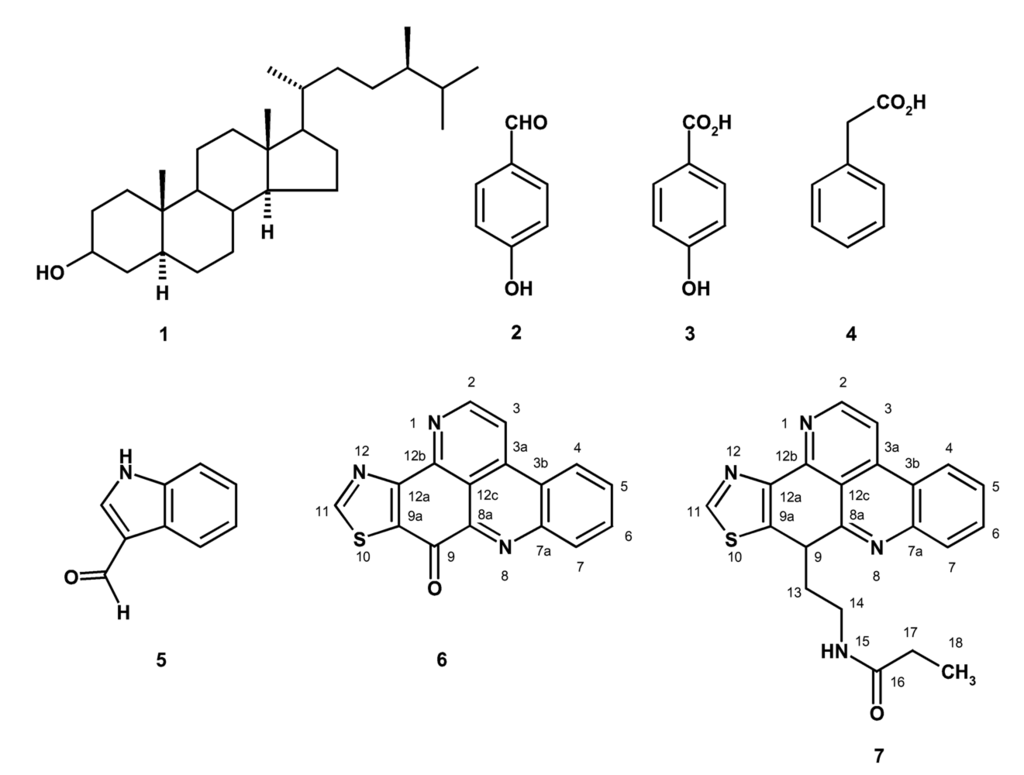 The crude EtOAc extract (13.1 g) was applied over a flash chromatography column of Si gel 60 (150g) and eluted with a solvent gradient system of petrol-CHCl3, CHCl3, CHCl3,-MeOH, EtOAc and MeOH, with 200 ml fractions being collected as follows: Frs. 1–2 (petrol-CHCl3,1:4), 3–7 (CHCl3), 8–17 (CHCl3,-MeOH, 49:1), 18–22 CHCl3,-MeOH, 19:1), 23–24 (CHCl3,-MeOH, 9:1), 25–26 (EtOAc), 27–30 (MeOH). Frs. 3–4 were combined (2.6 g) and recrystallized from a mixture of petrol and CHCl3 to give white crystal of 24 α-methylcholestanol (1, 436 mg). Frs. 6–7 were combined (870 mg) and chromatographed over Si Gel 60 (20 g) and eluted with petrol-CHCl3, CHCl3-Me2CO, and CHCl3-MeOH, 200 ml subfractions were collected as follows: Sfrs. 1–7 (petrol-CHCl3, 2:3), 8–15 (petrol-CHCl3, 1:4), 16–24 (CHCl3), 25–30 (CHCl3-Me2CO, 19:1), 31–34 (CHCl3-Me2CO, 9:1), 35–38 (CHCl3-Me2CO, 4:1), 39–43 (CHCl3-Me2CO, 3:2), 44–45 (MeOH). Sfrs. 3–6 were combined (156 mg) and purified by TLC (Si gel, CHCl3) to give 33.2 mg of a mixture of p-hydroxybenzoic acid (3) and phenylacetic acid (4). Subfrs. 7–15 were combined and purified by TLC (Si gel, CHCl3-Me2CO-HCO2H, 18:1:0.1) to give kuanoniamine A (6, 20 mg). Frs. 8–10 were combined (390 mg) and purified by TLC (Si gel, CHCl3, Me2CO, HCO2H, 95:5:0.1) to give p-hydroxybenzaldehyde (2, 15.7 mg) and 3-formylindole (5, 18.6 mg). Frs. 11–13 were combined (346 mg) and purified by TLC (Si gel, CHCl3, MeOH, HCO2H, 98:2:0.1) to give kuanoniamine A (6, 32 mg). Frs. 20–22 were combined (355 mg) and applied over a flash chromatography column of ODS gel (10g) and eluted with a gradient system of MeOH-H2O and MeOH-CHCl3-H2O, 100 ml fractions being eluted as follows: sfrs 1–2 (MeOH-H2O, 7:3), 3–4 (MeOH-H2O, 4:1), 5–6 (MeOH-H2O, 9:1), 7–10 (MeOH), 11–14 MeOH-CHCl3-H2O, 7:3:0.5). Sfrs. 5–6 were combined (81 mg) and recrystallized from a mixture of CHCl3 and Me2CO to give yellow crystals of kuanonamine C (7, 44 mg).