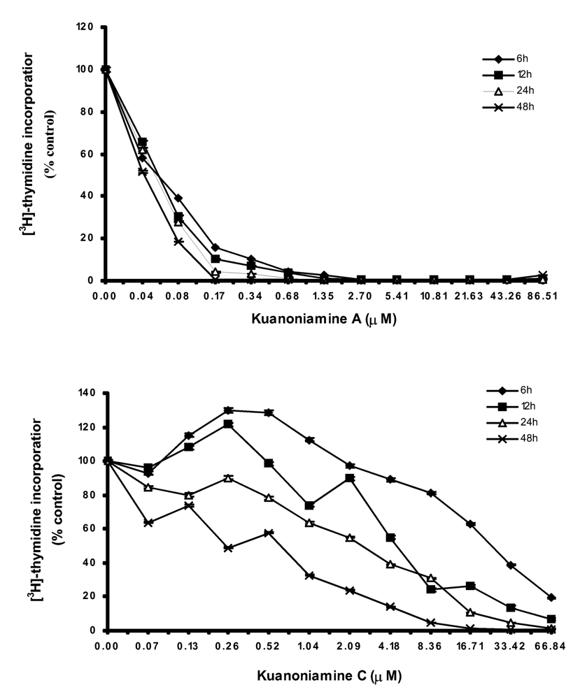 Figure 2). The dose-response curve showed that kuanoniamine A (6) dramatically affected DNA synthesis, even at concentrations as low as 0.08 μM, which were associated with a decrease in thymidine incorporation of more than 60% when compared with untreatead control cells. It was also found that the effect on DNA synthesis was mainly dependent on the concentration of kuanoniamine A (6) rather than on the exposure time. On the contrary, the effect of kuanoniamine C (7) was found to be dependent either on the concentration or the exposure time. Although an inhibition of DNA synthesis was also observed with kuanoniamine C (7), an interesting stimulatory effect was detected at low concentrations and exposure periods of 6 and 12 h. A maximum stimulation of 130% was reached after 6 h of treatment with 0.26 and 0.52 μM. This biphasic effect in DNA synthesis of ER (+) MCF-7 cells, expressed by a stimulatory effect at low concentrations and an inhibitory effect at high concentrations, resembles the behaviour described for phytoestrogens on ER (+) breast cancer cells [