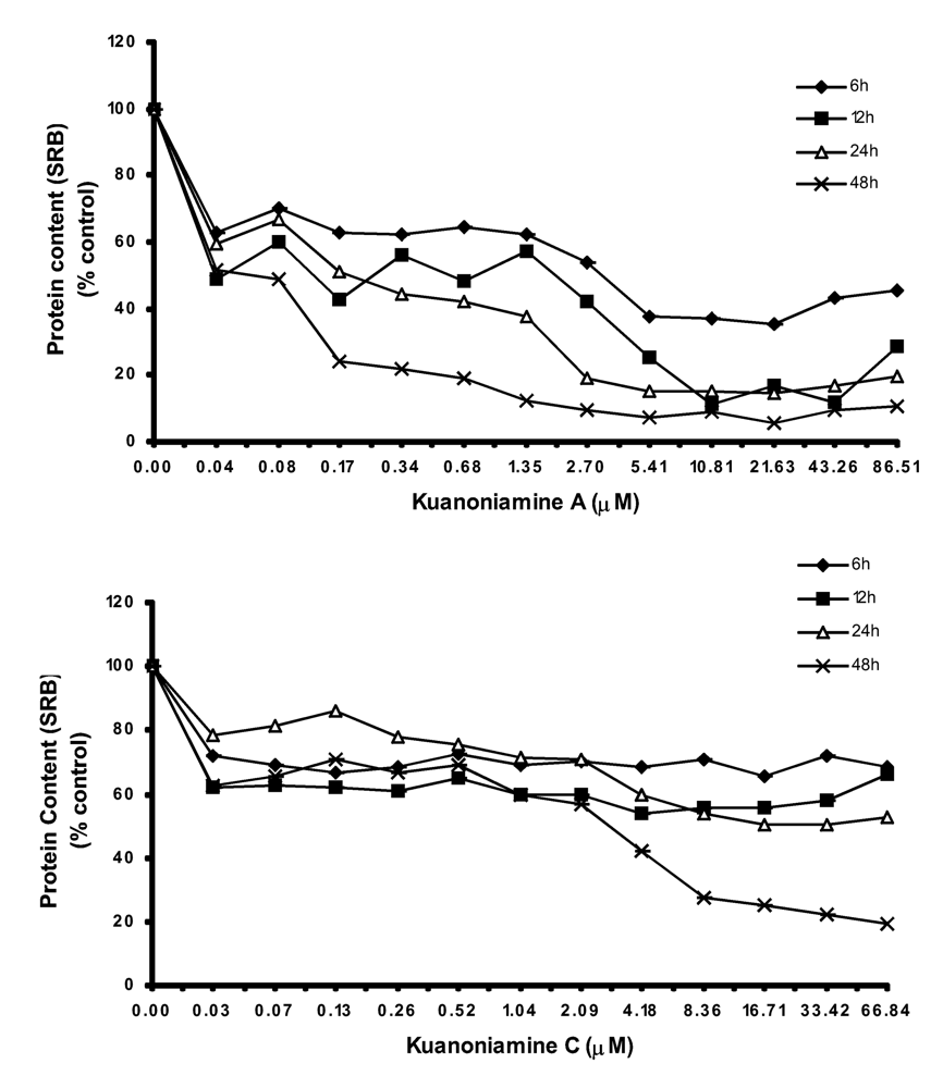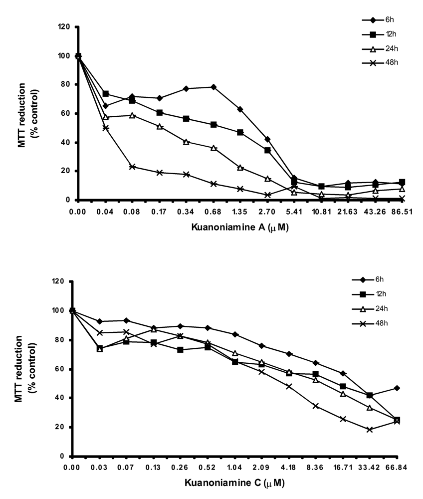 19]. Exponentially growing cells were then exposed for 48 h to five serial concentrations of kuanoniamine A (0.14; 0.69; 3.46; 17.30 and 86.51 μM) and kuanoniamine C (0.11; 0.53; 2.67; 13.37 and 66.84 μM) that were starting from a maximum of 25 μg/ml (86.51 μM and 66.84 μM, respectively).