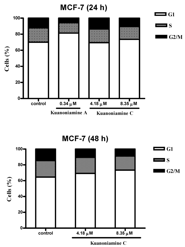 To further investigate the effect of these two compounds on MCF-7 cell proliferation, the cells were exposed for 24 and 48 h to 0.34 μM of kuanoniamine A (