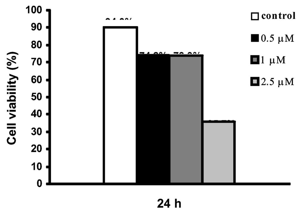 Figure 6) remained moderately high ( 70%), which allowed apoptosis estimation. On the contrary, the concentration of 2.5 μM showed to be very toxic to cells causing the drastic decrease of viability for the values of 35.7% impairing apoptosis evaluation.
