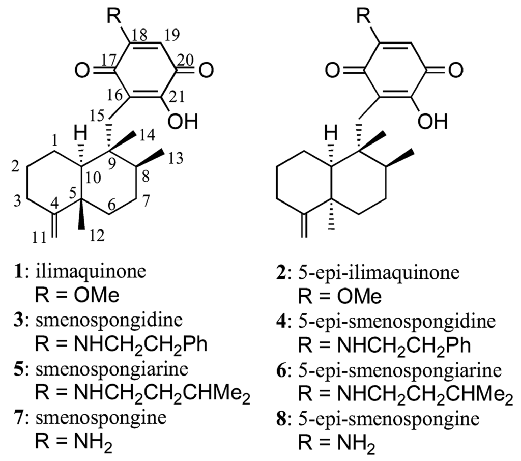 Eight sesquiterpene quinones: ilimaquinone (1), smenospongidine (3), smenospongiarine (5), smenospongine (7), and their corresponding 5-epimers 2, 4, 6, and 8, isolated from the Palauan marine sponge Hippospongia sp., were examined regarding their effects on TNF-α production in LPS-stimulated RAW 264.7 cells. 5-Epi-smenospongine (8) promoted the production of TNF-α to a level three times greater than the control at 10 μM, but compounds 1–7 did not show apparent activity. The results suggest that the cis-decaline ring and a primary amine in the benzoquinone ring are necessary for activity. This is the first study to report the modulation of TNF-α production by a sesquiterpene quinone.