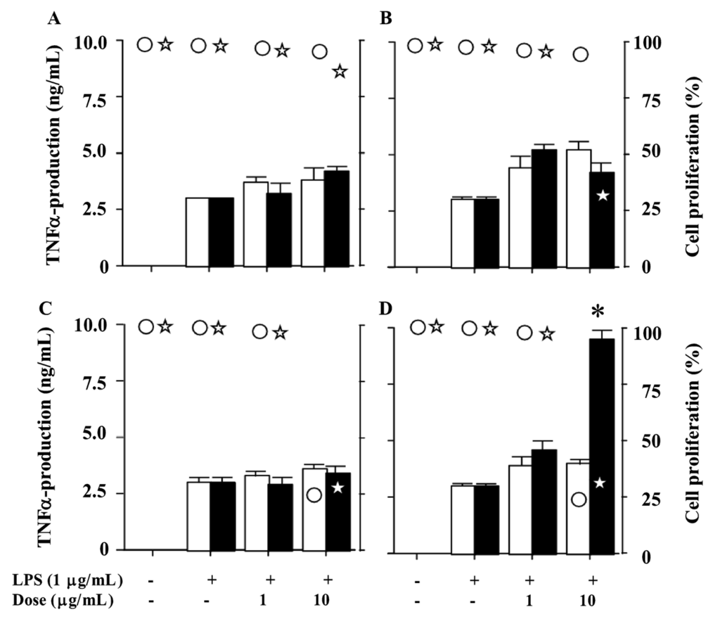 Cell proliferation was evaluated by enumerating the viable cells using the MTT formazan production method [16]. RAW264.7 cells (1 × 106 cells/mL) were treated with LPS (with or without test compounds) and then transferred to 96-well microtiter plates. After incubation for 24 h, 20 μL of MTT reagent (5 mg/mL in PBS) was added to each well and further incubated for 3 h. The production of formazan was assessed by measuring optical density (OD570 nm). Data are shown as the values relative (%) to each PMA-stimulated optical density.