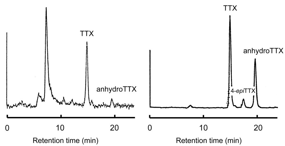 Based on the above suggestion that bacteria might be the primary source of TTX, in the 1980s we investigated the TTX production of marine bacteria. Intestinal bacteria from several TTX-bearing organisms were isolated, cultured, and examined for lethal potency to mice. Vibrio alginolyticus from the toxic starfish Astropecten polyacanthus [73,74], one Vibrio strain from the xanthid crab Atergatis floridus [11,74], and another Vibrio strain from the toxic marine pufferfish Takifugu snyderi [74] had a paralytic toxicity of 213, 30, and 3 MU per 500 ml of medium, respectively. The toxic principles produced peaks identical to those of authentic TTX and anhydrotetrodotoxin (anhydroTTX) in high performance liquid chromatography with post-column fluorescence derivatization (Figure 2)[74]. In addition, gas chromatography/mass spectrometry analyses revealed that they produce a C9-base, the degradation product of TTX, on alkaline hydrolysis [75], leading us to conclude that the isolated bacteria produce TTX. Shewanella alga and Alteromonas tetraodonis isolated from a red alga Jania sp. [76], Shewanella putrefaciens from a TTX-bearing marine puffer Takifugu niphobles [77], and some other marine bacteria isolated from TTX-bearing organisms [78] also produce TTX.