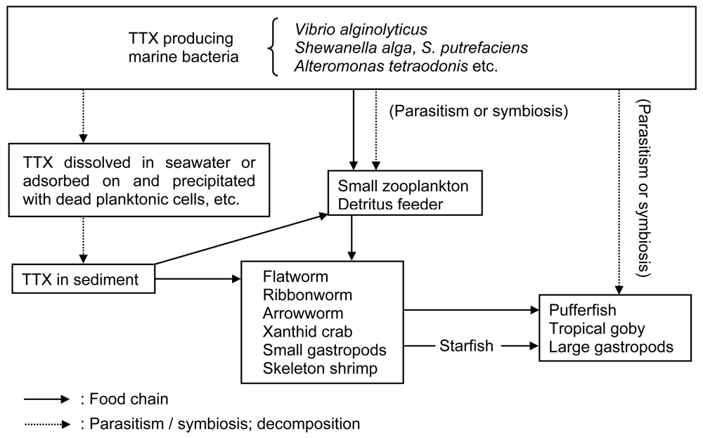 Many years ago when TTX was believed to be found exclusively in pufferfish, it was controversial whether TTX in the fish was endogenous (produced by the pufferfish itself) or exogenous (taken from the outside and accumulated). Subsequent findings, however, such as the distribution of TTX among many other organisms [9], the TTX intoxication of the trumpet shell following the ingestion of toxic starfish [10], TTX production by marine bacteria [11], and the facts pufferfish become non-toxic when artificially reared with non-toxic diets [12–14] and that such non-toxic pufferfish become toxic when fed TTX-containing diets [15–17], have elucidated that the main mechanism of TTX accumulation in pufferfish is the food chain, consisting of several steps and starting with marine bacteria as a primary source of TTX.
