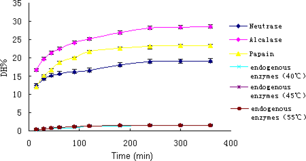 During the hydrolysis, the homogenate was rapidly converted from viscous mince into a free flowing liquid. Hydrolytic curves of A. subcrenata by the enzymes and endogenous enzymes alone were shown in Figure 1. All curves exhibited an initial fast reaction followed by a slowdown. The shape of these progress curves was similar to what has been reported for enzymatic hydrolysis of different protein substrates [22].