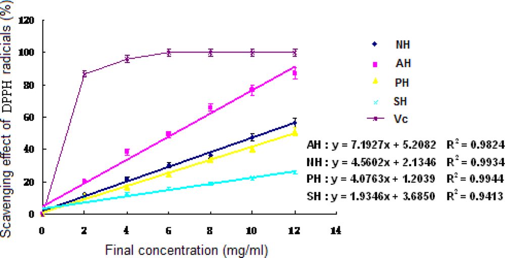 DPPH free radical scavenging activity of the extracts and hydrolysates of A. subcrenata. NH: the hydrolysate treated by neutrase; AH: the hydrolysate treated by alcalase; PH: the hydrolysate treated by papain; SH: the supernatant of unprocessed homogenate of A. subcrenata. Ascorbic acid (Vc) was used as positive control. Regression equations were obtained from linear regression of the concentrations of the extracts and hydrolysates of A. subcrenata and DPPH radical scavenging effects. Each value is expressed as mean ± S.D. (n = 3).
