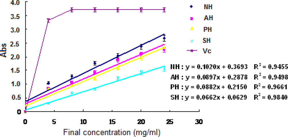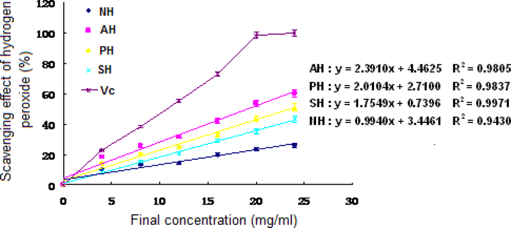 Hydrogen peroxide scavenging activity of the extracts and hydrolysates of A. subcrenata. NH: the hydrolysate treated by neutrase; AH: the hydrolysate treated by alcalase; PH: the hydrolysate treated by papain; SH: the supernatant of unprocessed homogenate of A. subcrenata. Ascorbic acid (Vc) was used as positive control. Regression equations were obtained from linear regression of the concentrations of the extracts and hydrolysates of A. subcrenata and hydrogen peroxide scavenging effects. Each value is expressed as mean ± S.D. (n = 3).