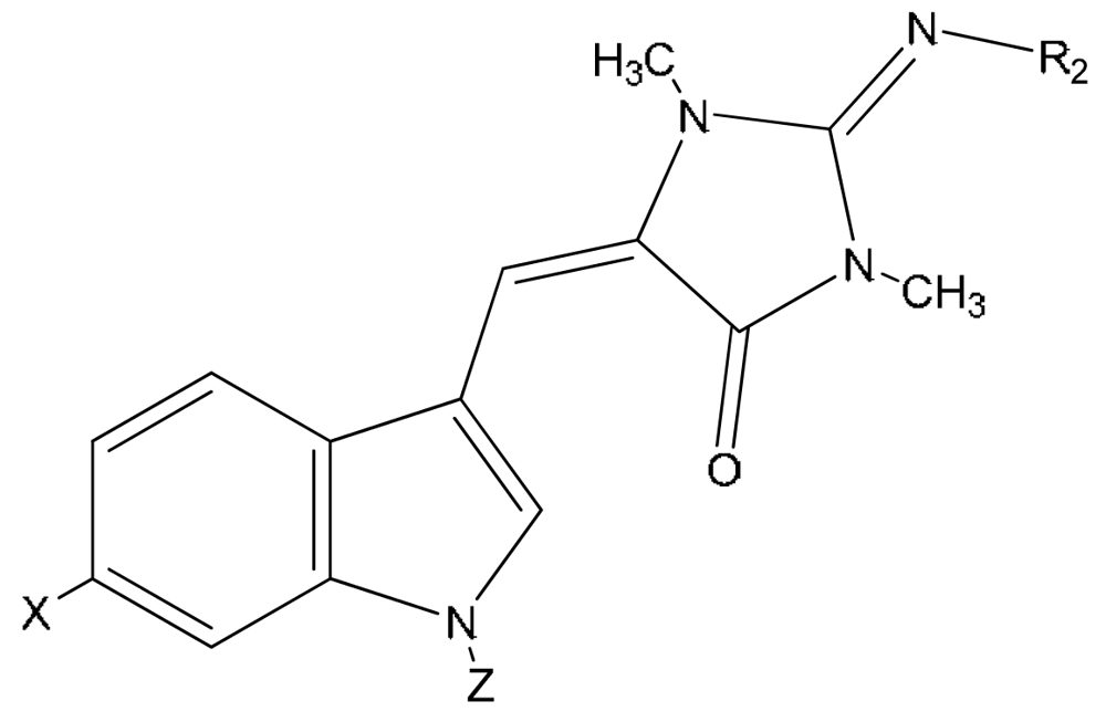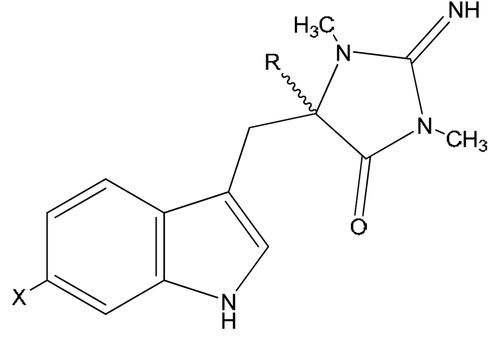 - Wells, KM; Murphy, PT. 5-(Indol-3-ylmethylene)-1,3-dimethyl-2-methylamino-4-imidazolidinone US Patent 4, 195, 179. 1980.