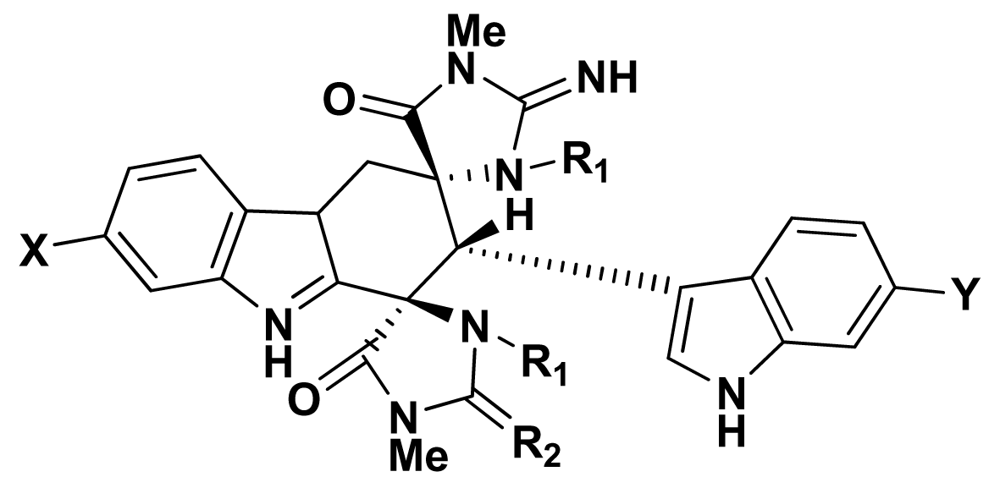 Dimers of aplysinopsin-type compounds.Compound 24: X = Br, Y = Br, R1 = H, R2 = NHCompound 25: X = H, Y = Br, R1 = CH3, R2 = NHCompound 26: X = H, Y = H, R1 = CH3, R2 = NHCompound 27: X = H, Y = H, R1 = CH3, R2 = O