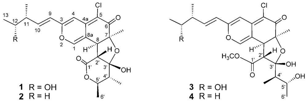 - Matsuzaki, K; Tanaka, H; Omura, S. Isochromophilones I and II, novel inhibition against gp120-CD4 binding produced by Penicillium multicolor FO-2338. II Structure Elucidation. J. Antibiot 1995, 48, 708–713. [Google Scholar] [CrossRef] [PubMed]