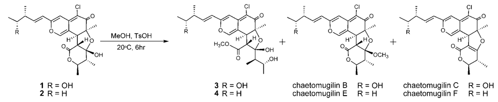 During the isolation process, the culture filtrate was extracted with AcOEt, and the time that 1 and 2 were exposed to MeOH on LH-20 and the silica gel column chromatography was very short (6~7 h being the longest time). In addition, chaetomugilins A (1) and D (2) were stable in MeOH for a few days. As the above reaction, only compounds 3 and 4 were obtained in low yield by treatment with p-TsOH of 1 and 2 in MeOH, respectively, but not obtained by the methanolysis using conc. H2SO4. These evidences confirm that seco-chaetomugilins A (3) and D (4) are not artifacts of 1 and 2, respectively.