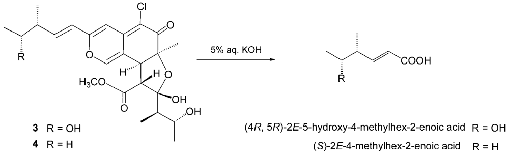 Seco-chaetomugilin D (4), which contained one oxygen atom less than 3, was assigned the molecular formula C24H31ClO7 by HRFABMS. The general features of its UV, IR, and NMR spectra (Table 1) closely resembled those of 3 except that the proton signals for H-11 (δH2.24, sept), H-12 (δH1.42, m), and H-13 (δH0.89, t), and the carbon signals for C-10 (δC 146.2), C-11 (δC 38.8), C-12 (δC 29.2), C-13 (δC 11.7), and 11-CH3 (δC 19.4) in 4 revealed a chemical shift difference relative to those of 3. The above evidence implied that the hydroxyl methine at C-12 in 3 was replaced with a methylene in 4. The planar structure of 4 was confirmed by analyzing 1H-1H COSY correlations and HMBC correlations. In NOESY experiments, the same NOE correlations (8-H/4′-CH3 and 7-CH3/4′-CH3) as those of 3 were observed. As in compound 3, treatment with p-TsOH of 2 in MeOH gave product 4, which was confirmed to be identical to natural 4 on the basis of IR, UV, and NMR spectra and optical rotations. The above lines of evidence revealed the absolute stereostructure of 4. In order to confirm the absolute configuration of C-11, the alkaline degradation was applied to compound 4 by the above method. The degradation of 4 with 5% potassium hydroxide afforded a carboxylic acid that was identified as (S)-2E-4-methylhex-2-enoic acid by comparison of spectral data and specific optical rotation with those of a commercial sample (Scheme 2) [11]. Thus, the absolute configuration at C-11 was supported as S.