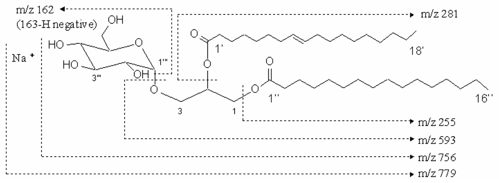 The compound 1 was colorless. Its infrared spectrum presented characteristic absorption bands at 2920 cm−1, 2852 cm−1, 1742 cm−1, 1219 cm−1, 1171 cm−1, 1035 cm−1, and 771cm−1. The positive-ion fast atom bombardment mass of the compound 1 gave the molecular weight with sodium ion at m/z 779 [M+Na]+ and fragment ions at 594 [M-163 (hexose moiety)+H]+, 256 [M-501 (163: hexose moiety, 281: oleoyl moiety, 57: glycerol moiety)+H]+, 282 [M-475 (163: hexose moiety, 255: palmitoyl moiety, 57: glycerol moiety) +H]+ by an assistant of trimethanolamine (Fig. 1). Using a negative-ion fast atom bombardment mode, other fragment ions were found at 162 [M-593 (281: oleoyl moiety, 255: palmitoyl moiety, 57: glycerol moiety)-H]−. These fragment ions suggested the molecule of this compound contains three parts, hexose unit and two fatty acyl moieties from single dimensional spectrum. The molecular formula was deduced to be C43H80O10 based on the fast atom bombardment masses, 13C and 1H NMR spectra.