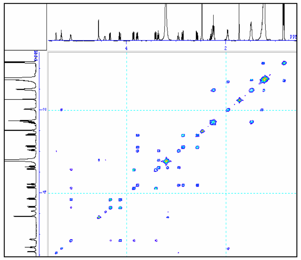 The 1H-1H correlation spectroscopy experiment was carried out at 600.05 MHz with a sweep width of 4164.3 Hz and 2989.5 Hz. A 0.83-second relaxation delay was used and 16 transients were accumulated for each t1 value.