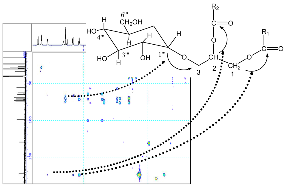 The glycosidic linkage between the glucose and glycerol was determined by glycosidation shift in 13C-NMR and HMBC spectra, the chemical shift of C-1‴ in glucose unit was at δ98.3. Its proton was obviously correlated with the signal of C-3 in HMBC spectrum. In HMBC spectrum, two correlations were observed between the proton signal at δ4.21 (dd, J = 2.6, 12.1) or δ5.12 and the quaternary carbon signal at δ172.2 or δ172.4, suggesting the glycerol moiety was attached to C-1′ or C-1″ of the fatty moiety. The carbons and protons resonances of fatty residue moieties possess correlation, resulting in many cross peaks in 1H-1H COSY (Fig. 2) and HMBC spectrum (Fig. 3).