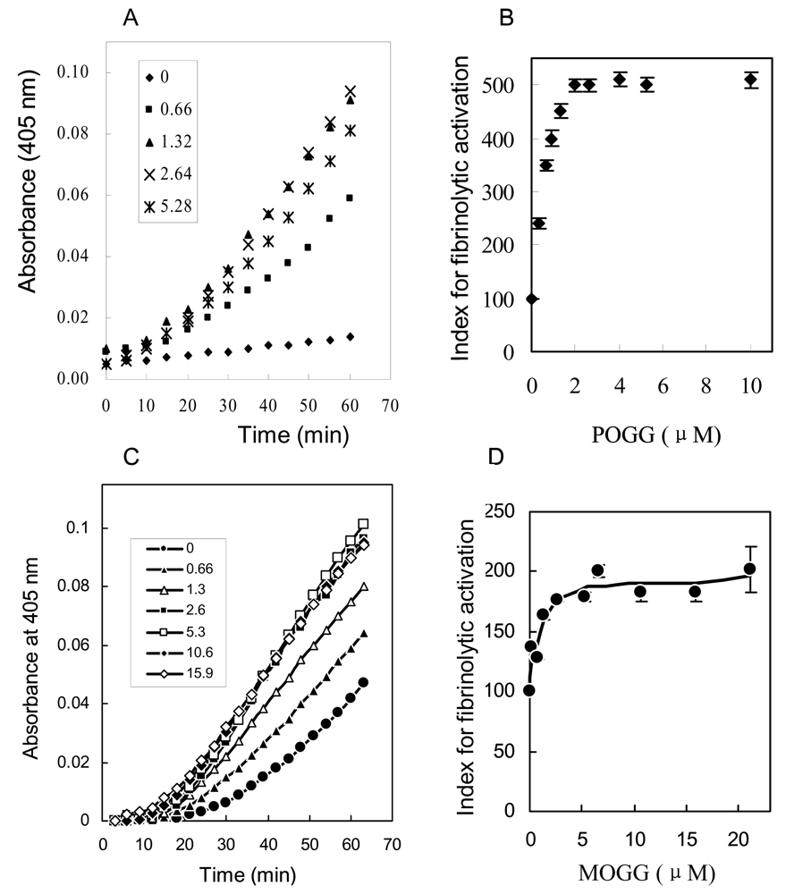 Pro-u-PA and plasminogen were incubated with the indicated concentrations of POGG and MOGG in the presence of Spectrozyme UK to determine reciprocal activation of pro-u-PA. Time course of the POGG and MOGG effect is shown in A, C and dose-response curve in B, D, respectively, in which the index for fibrinolytic activation is given in ordinate as percent of control value.