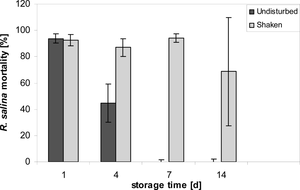 Mortality of R. salina [%] exposed to supernatant stored for 1, 4, 7, and 14 days at 15 ºC. Results expressed as triplicate mean ± 1SD.