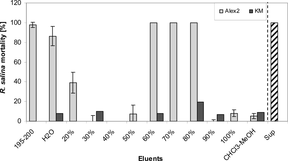 Mortality of R. salina (%) exposed to different eluate fractions obtained after reversed phase solid phase extraction (SPE) of 200 mL supernatant (Alex2, grey bar) or 200 mL K-medium (negative control, KM (K-medium), black bar): 195–200 = last 5 mL sample load eluate; H2O = water wash; 20–100% = percentage of aqueous methanol; CHCl3-MeOH = 1:1 (v/v) mixture of chloroform/methanol; Sup = untreated supernatant (positive control). Results expressed as triplicate mean ± 1SD.