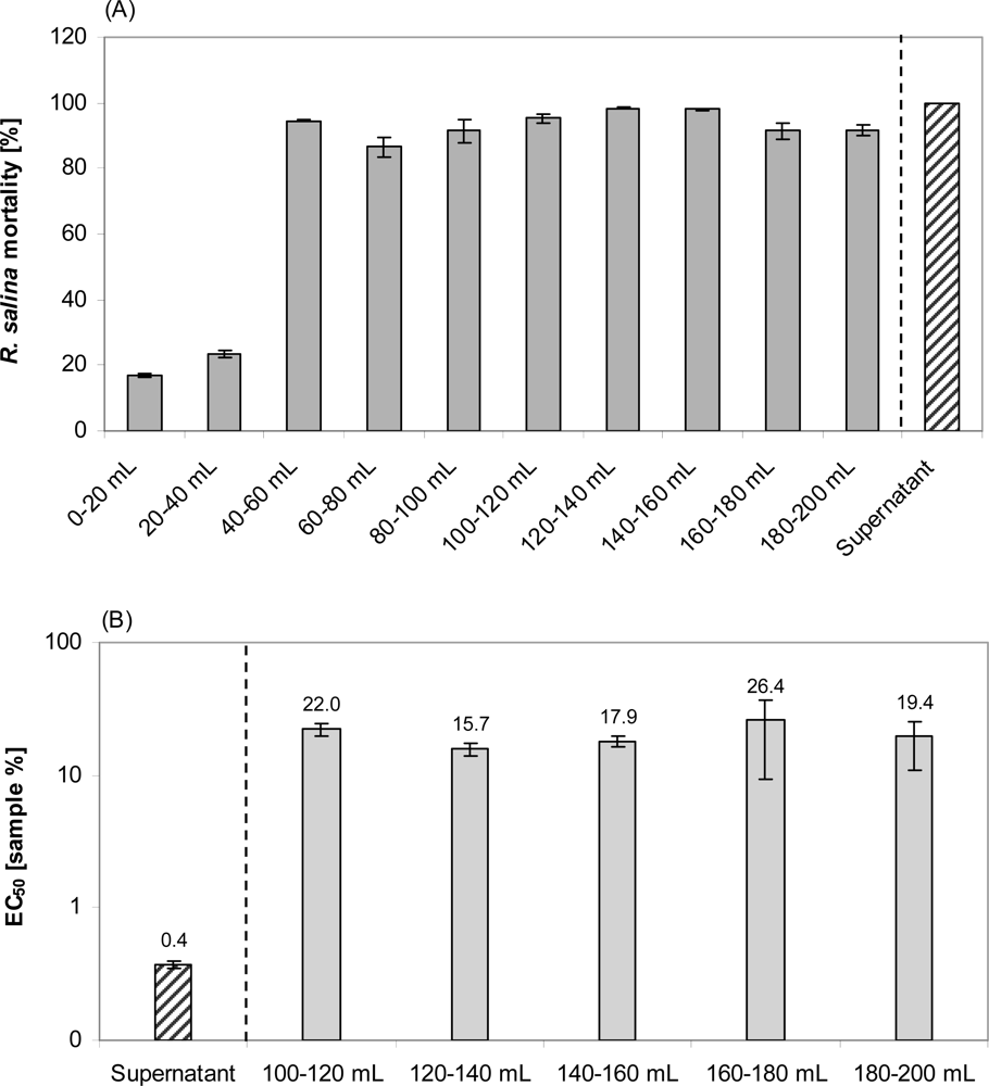 R. salina exposed to consecutive eluate fractions (as indicated below the bars) of reversed phase solid phase extraction (SPE) of 200 mL supernatant or exposed to untreated supernatant (positive control). (A). R. salina mortality from one-point bioassay. (B). EC50 and 95% confidence interval. Results expressed as duplicate mean ± 1SD.