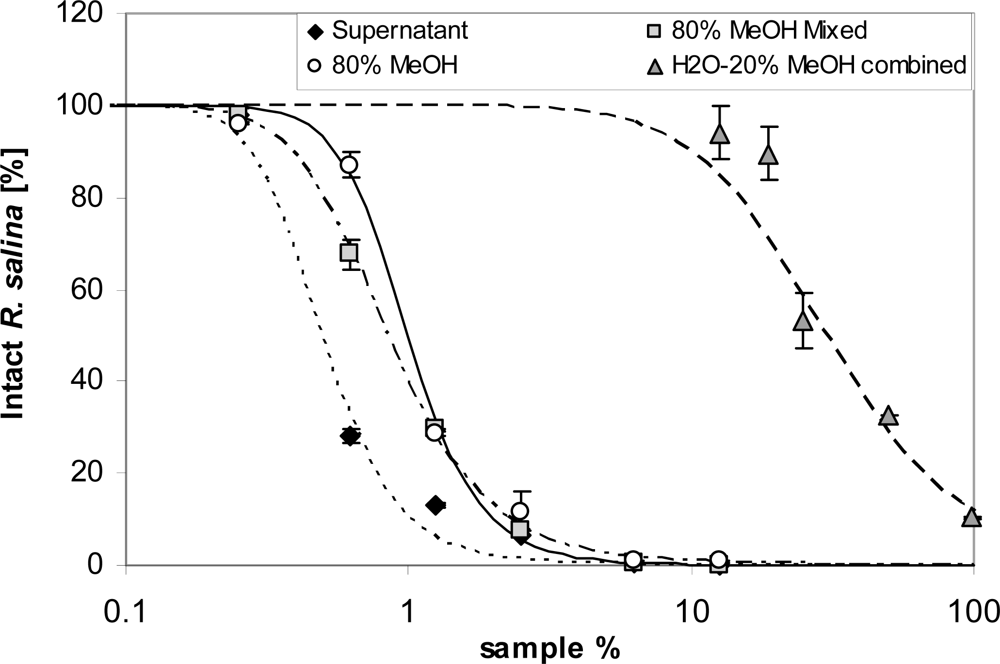 Intact cells of R. salina (% of control) exposed to different eluate fractions of 200 mL supernatant obtained with reversed phase solid phase extraction (SPE) or to dilutions of untreated supernatant (black dots, positive control): 80% MeOH = 5mL aliquot of 80% methanol fraction, evaporated and dissolved in 5 mL K-medium; 80% MeOH mix = 5 mL aliquot of 80% methanol fraction evaporated and dissolved in 5mL of last 20 mL sample load eluate; H2O-20% MeOH combined = 10 mL water and 10 mL 20% methanol fraction evaporated and dissolved in 20 mL K-medium. Results expressed as duplicate mean ± 1SD.