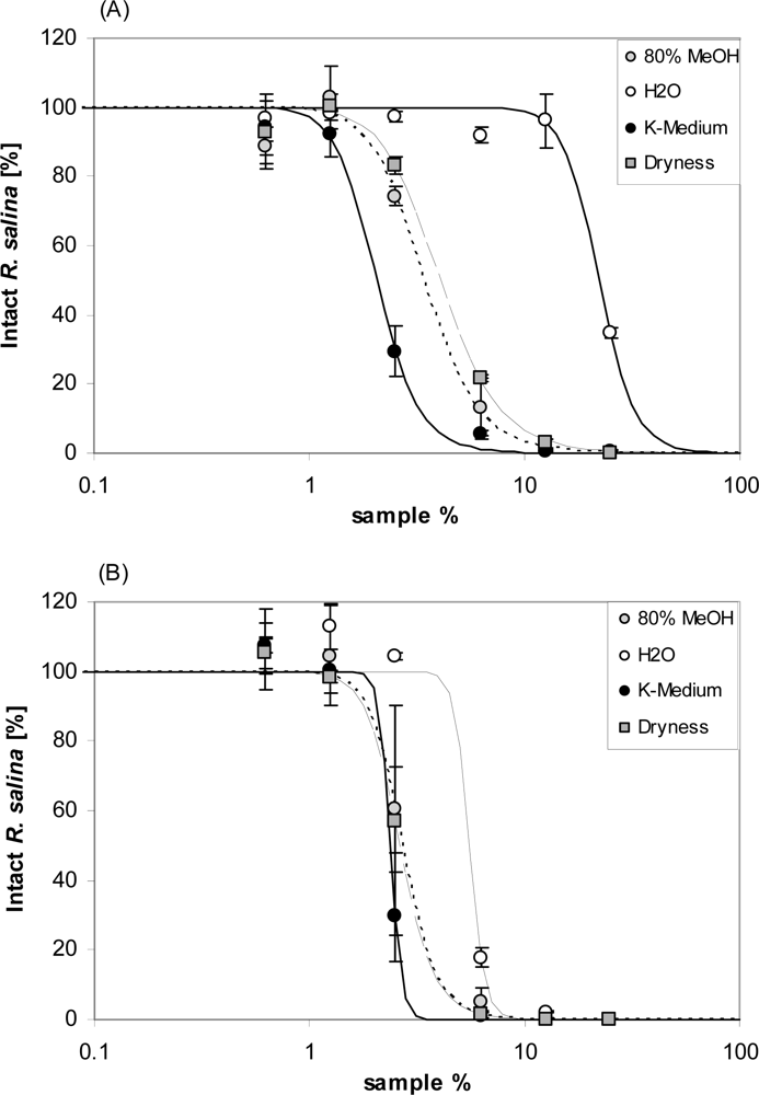 Intact cells of R. salina (% of control) exposed to four 80% methanol SPE fractions of supernatant, each stored at different conditions (for explanation see text): 80% MeOH = unchanged; H2O = solvent evaporated and re-dissolved in deionized water; K-Medium = solvent evaporated and re-dissolved in K-medium; Dryness = solvent evaporated. (A) after 2 days storage. (B) after additional 2 days storage in K-medium. Results expressed as duplicate mean ± 1SD.