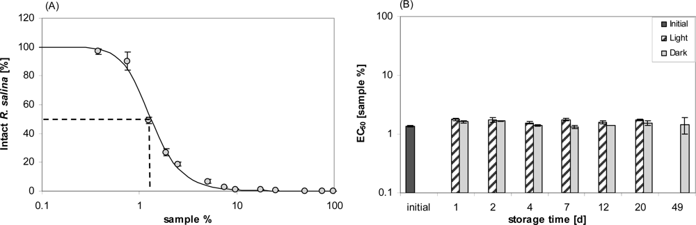 Lytic activity was however easily reestablished by shaking the containers vigorously before removal of stored supernatant. Even after 14 days the apparent loss of lytic activity could be reestablished by shaking. With a vigorous shaking before sub-sampling, a detailed quantitative experiment on stability under normal culture conditions was then performed. For the initial sample, the dilution curve (Figure 2A) yielded an EC50 value of 1.3% (1.2–1.4%; sample concentration in %). EC50 values determined after different storage time varied, but with an overall mean of 1.6% did not show any significant decrease in lytic activity over time, neither in flasks kept in the light nor in darkness (Figure 2B). Bacterial concentration in the stored supernatant, as determined for Day 7, was high (light: 1.63 ± 0.35 × 107 mL−1: dark: 1.52 ± 0.19 × 107 mL−1) and not significantly different between light and dark bottles (t-test, n = 2).