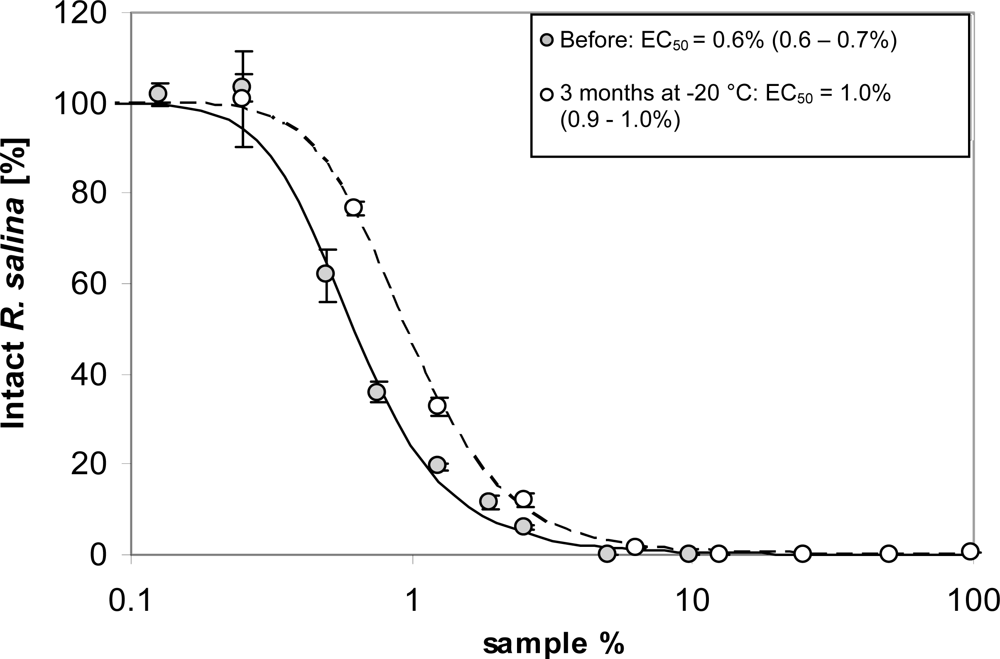 Intact cells of R. salina (% of control) exposed to a dilution series of supernatant before (grey dots) and after 3 months storage at −20 °C (white dots). Symbols represent triplicate mean ± 1SD. Figure insert shows corresponding EC50 values (95% confidence interval).