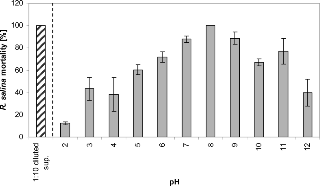 Mortality of R. salina cells (%) exposed to supernatant (1:10 diluted) after 3-day storage at pH 2 to 12 at 15 °C. Samples were re-adjusted to pH 8 before performing the bioassay. Results expressed as duplicate mean ± 1SD. sup. = supernatant (positive control).