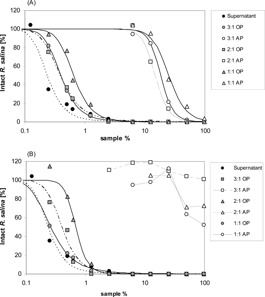 Intact cells of R. salina (% of control) exposed to dilution series of supernatant (black dots) or to organic phase (white symbols) and aqueous phase (grey symbols) of supernatant extracted with organic solvents with various composition and ratio. (A) dichloromethane: methanol; (B) chloroform: methanol. AP = aqueous phase; OP = organic phase.