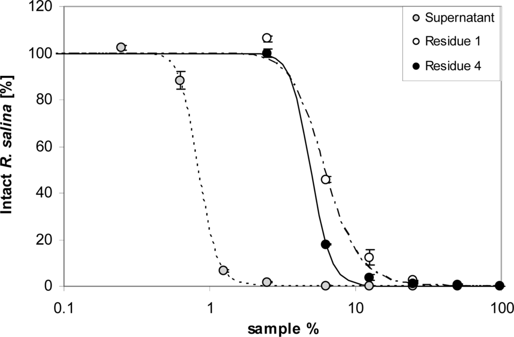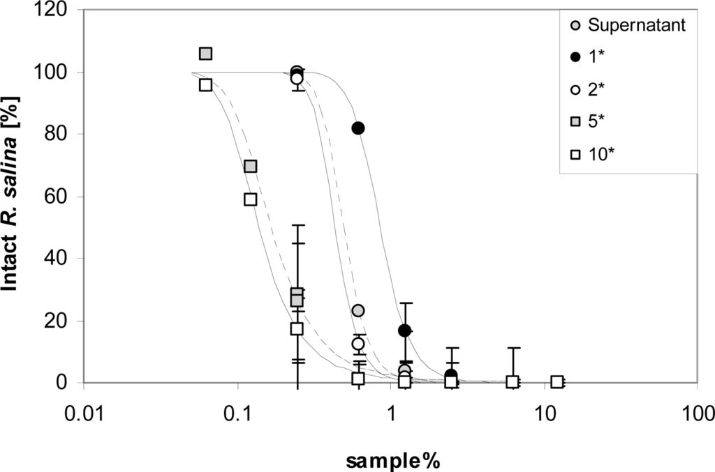 Intact cells of R. salina (% of control) exposed to dilution series of supernatant (grey dots) or residues from 5 kDa ultrafiltration from the first and fourth run of filtration (see text). Results expressed as duplicate mean ± 1SD.