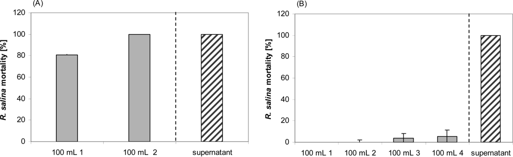 Mortality of R. salina exposed to supernatant ultrafiltrate or to supernatant of the same batch (positive control). (A) 500 kDa cutoff filtrate; 100 mL 1 = first 100 mL filtrate of 100 mL supernatant; 100 mL 2 = second 100 mL filtrate of 100 mL supernatant. (B) 5 kDa cutoff filtrate; 100 mL 1 = first 100 mL filtrate of 120 mL supernatant; 100 mL 2 = second 100 mL filtrate of 120 mL supernatant; 100 mL 3 = third 100 mL filtrate of 120 mL supernatant; 100 mL 4 = fourth 100 mL filtrate of 120 mL supernatant. Results expressed as duplicate mean ± 1SD.