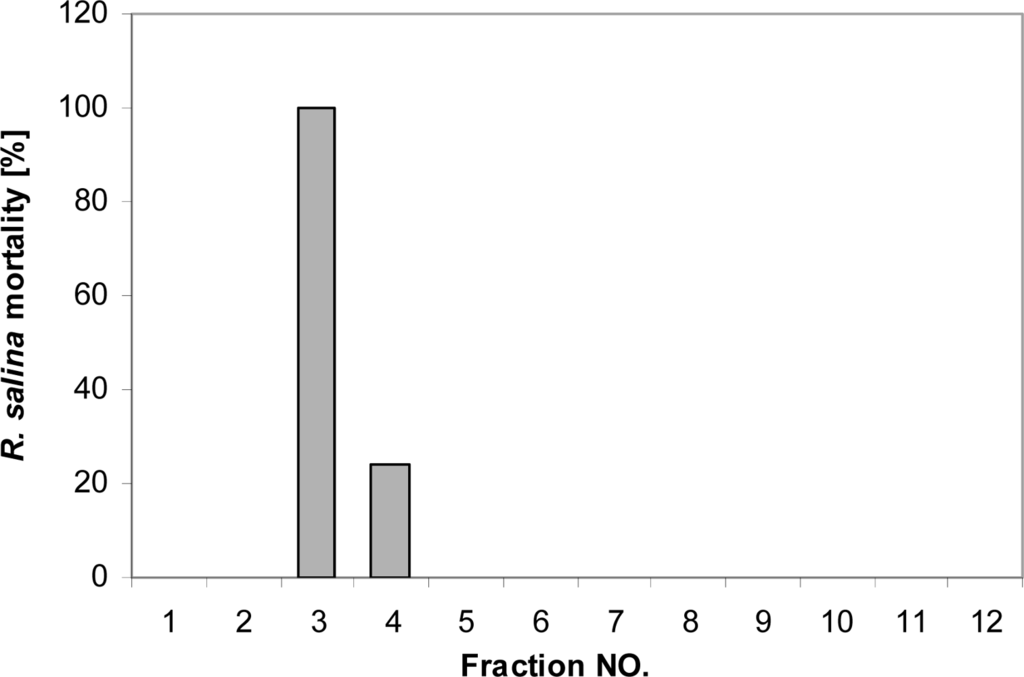 Mortality of R. salina (%) exposed to fractions collected after gel permeation chromatography. The first two fractions correspond to the column void volume.