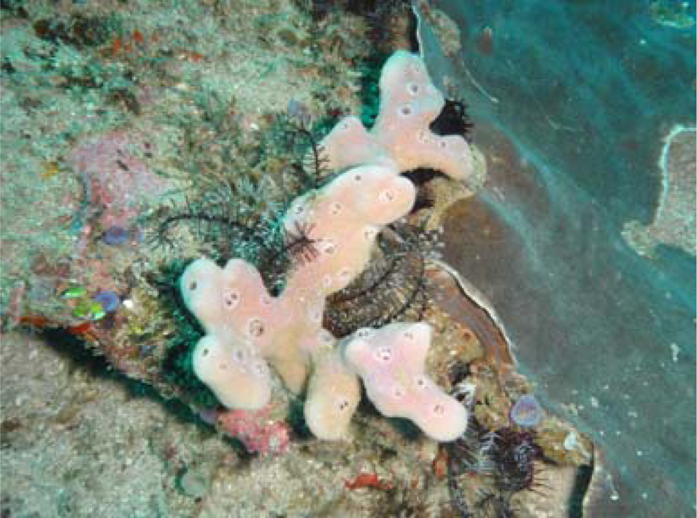 The sponge shown below in Figure 2 was collected at a depth range of 20–35 m by hand during scuba diving on the strait between Alor and Pantar Islands, Nusa Tengara Timur, Indonesia. The specimen was identified by one of the authors (NJdV) as Haliclona sp., Chalinidae, Haplosclerida, and deposited at Naturalis, National Museum of Natural History, Leiden, the Netherlands, with a code RMNH POR 4825.