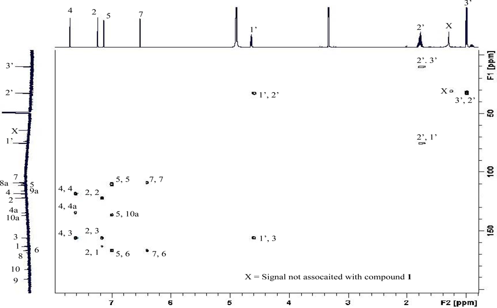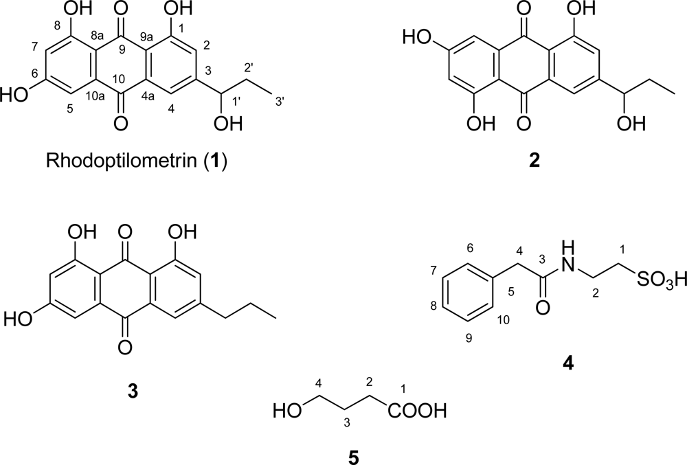 Together with rhodoptilometrin (1), 3-propyl-1,6,8-trihydroxy-9,10-anthraquinone (3), or dehydroxyrhodoptilometrin, was also isolated and characterized spectroscopically. From comparison of the 1H- and 13C-NMR data for 1 with that obtained for 3, together with the accurate mass data, it was evident that 3 was also a tetra-substituted anthraquinone with three hydroxyl groups and an aliphatic moiety at C-3. The differences in the 1H- and 13C-NMR chemical shifts of the aliphatic substituent between 1 and 3 clearly revealed the presence of a propyl moiety at C-3. For 3, complete assignment of 1H- and 13C-NMR data are provided for the first time; see Experimental Section and Table 1.